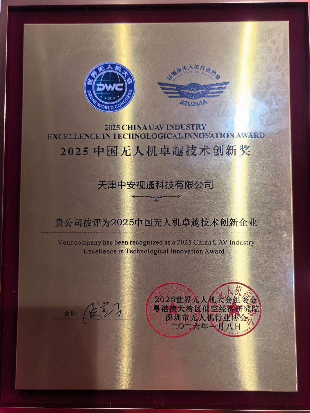 在随后的“低空经济·飞向未来”2026全国无人机界迎春团拜会暨第十届无人机百人会中,协会副理事长吴泽再度斩获殊荣,荣登“2025中国低空经济领航者”榜单,实现两天双奖、荣誉双收的佳绩,备受行业同仁赞誉。与此同时,中安视通凭借过硬的技术创新实力与深耕低空安全领域的积淀,同步斩获“2025中国无人机卓越技术创新奖”,个人与企业双向发力,殊荣双至。